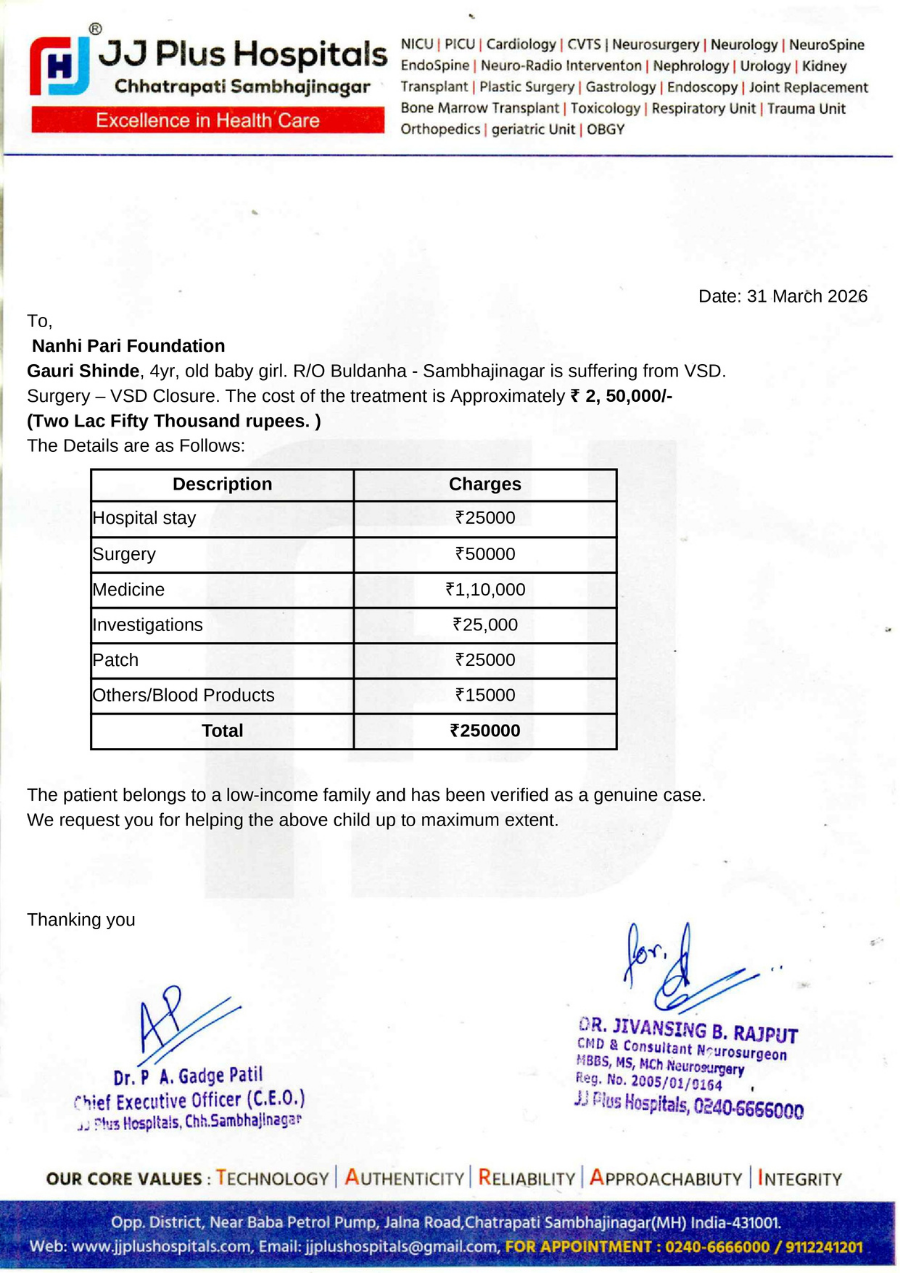 Baby Gauri Shinde, a 4-year-old girl child, has been diagnosed with Congenital Heart Disease (Ventricular Septal Defect – VSD) and is currently undergoing treatment at J.J. Hospital, Aurangabad. Medical experts have confirmed that due to her critical condition, she requires urgent VSD closure surgery to prevent further complications and stabilize her health. The surgery is tentatively scheduled for the last week of April 2026 under the guidance of Dr. P.A. Gadge Patil and Dr. Jivansing B. Rajput.