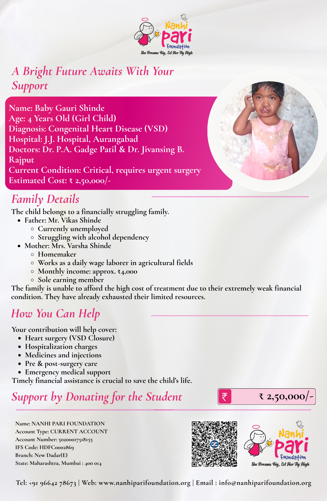 As per the doctors’ advice, her heart surgery is scheduled to be conducted at JJ Plus Hospital, Aurangabad, towards the end of April 2026. This procedure is crucial for her survival and long-term health.