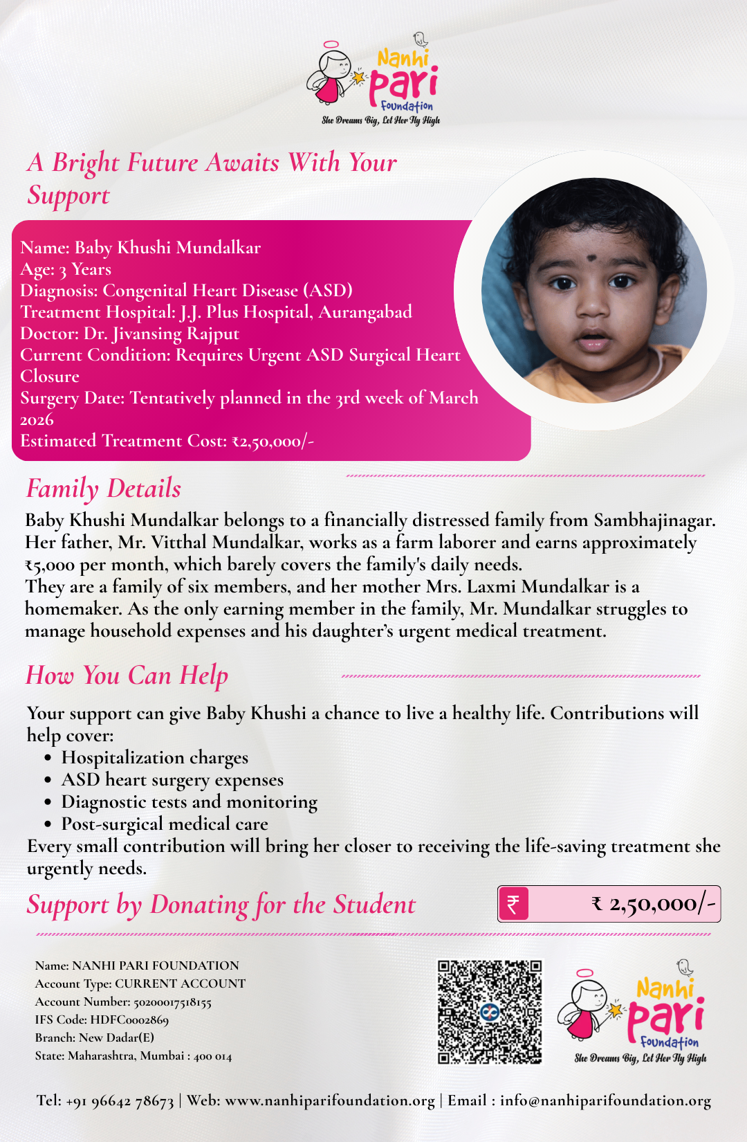 We would like to inform you that Baby Khushi Mudalkar is scheduled for a critical heart surgery on 8th March, 2026.