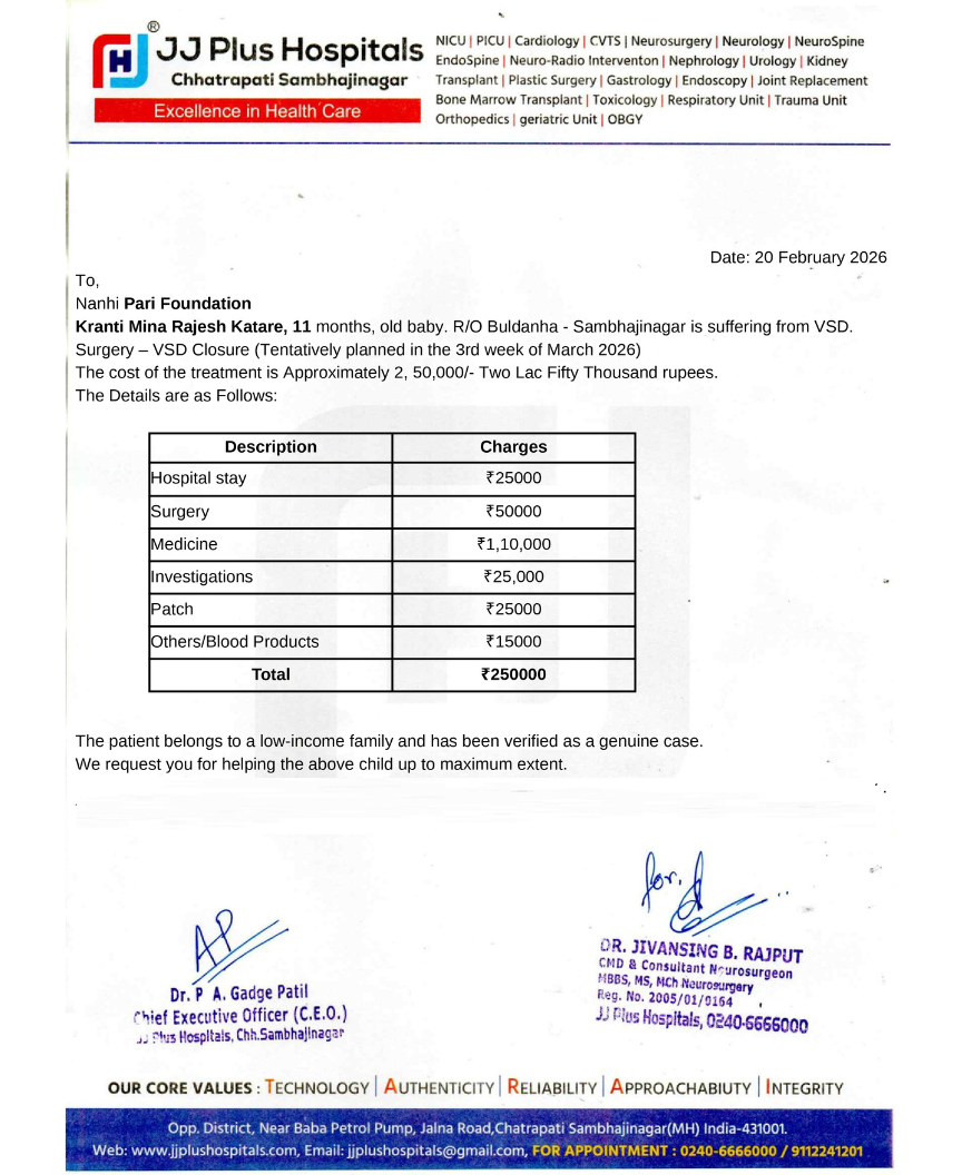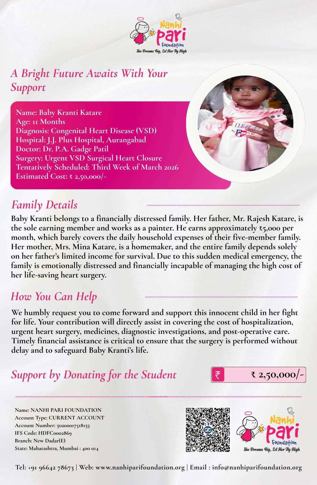 Baby Kranti Katare, an 11-month-old girl child, has been diagnosed with **Congenital Heart Disease**. Medical evaluation at **J.J. Plus Hospital, Aurangabad**, confirms the severity of her condition and the urgent need for surgical intervention to prevent life-threatening complications.