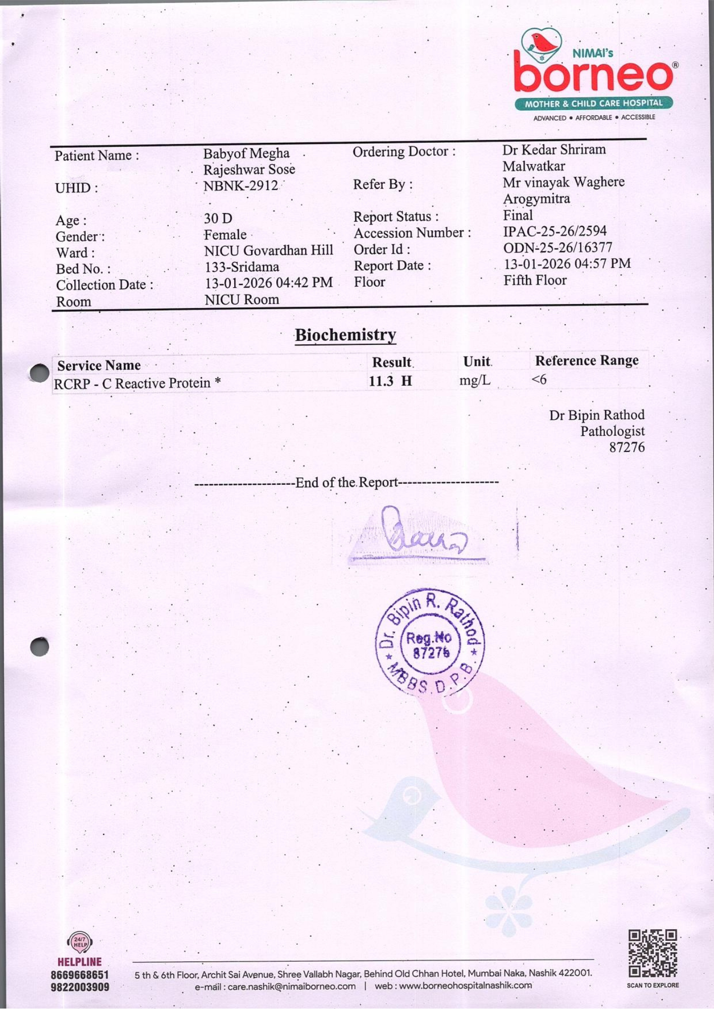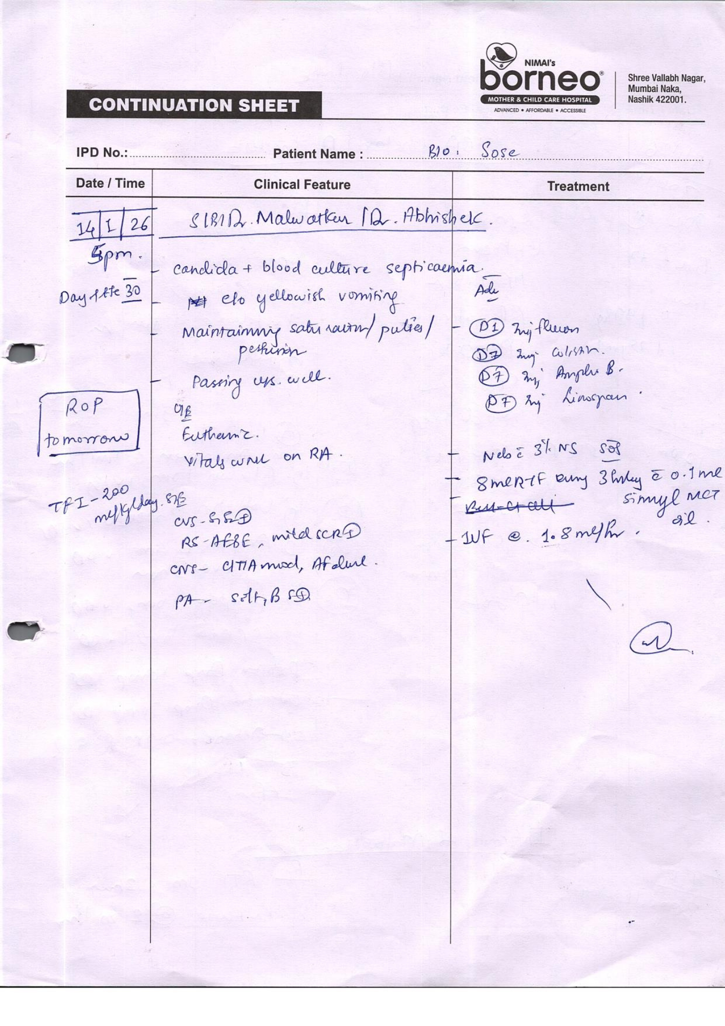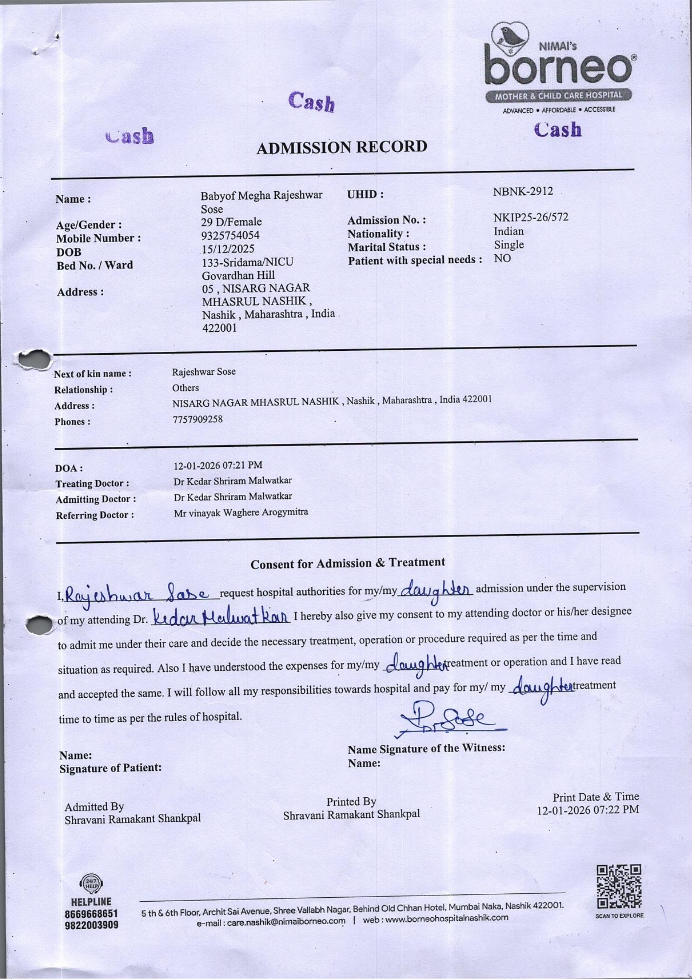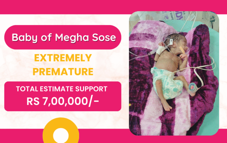 Baby of Megha Rajeshwar Sose, just one month old, is currently fighting for survival in the Neonatal Intensive Care Unit (NICU) at Nimai’s Borneo Mother and Child Care Hospital, Nashik. From the very moment she was born, her life has been a continuous medical battle. She was born extremely premature at 29 weeks and 1 day, weighing only 830 grams. Due to her fragile condition, she has remained in the NICU since birth, relying entirely on intensive medical care to stay alive.