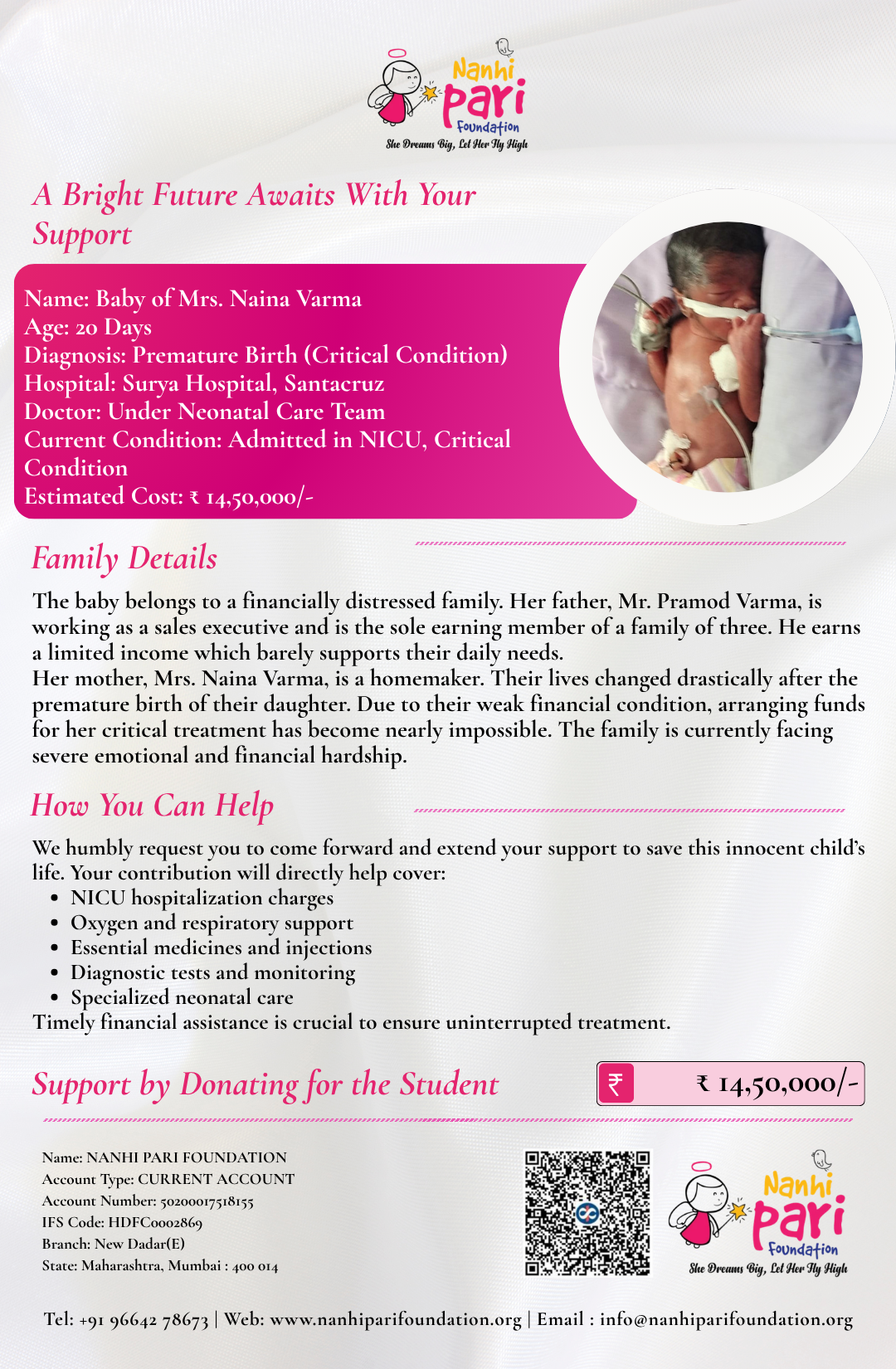 Baby of Mrs. Naina Varma, a 20-day-old girl child, has been diagnosed as a case of premature delivery and is currently undergoing treatment at Surya Hospital, Santacruz. Medical experts have confirmed that due to her critical condition, she requires urgent NICU care and continuous medical support to stabilize her health and prevent life-threatening complications.