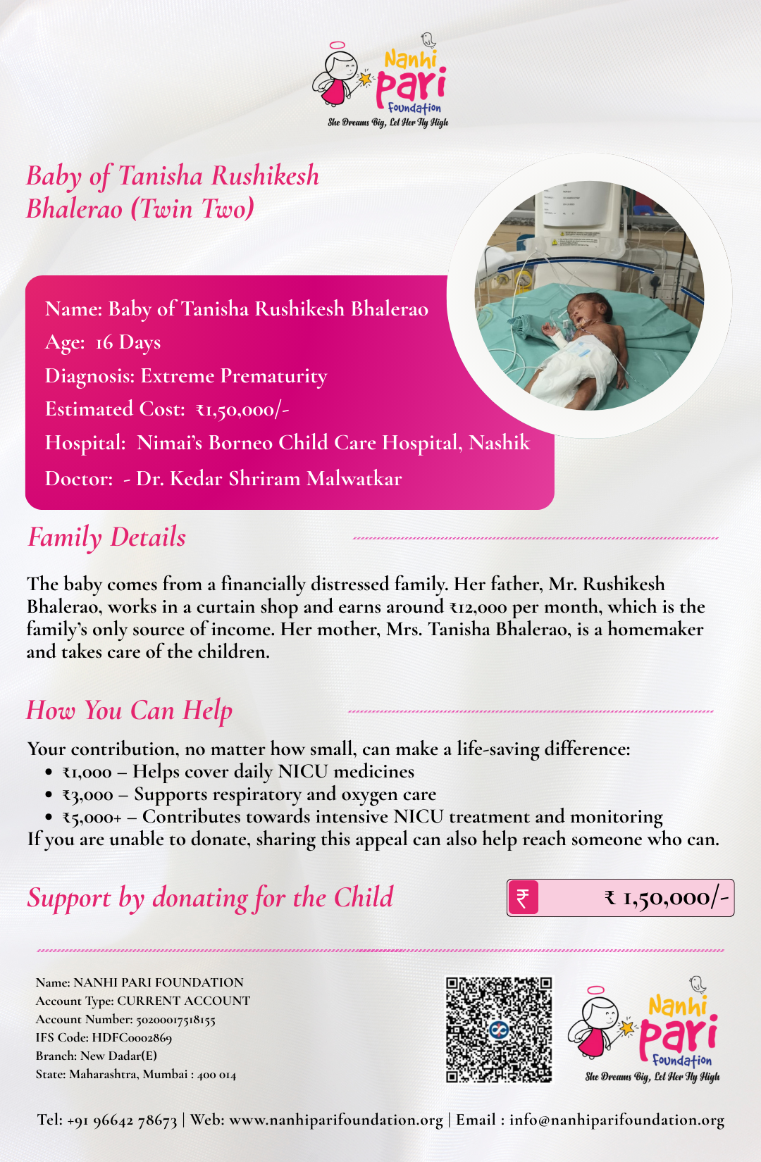 Baby of Mrs. Tanisha Rushikesh Bhalerao (Twin Two) is a 16-day-old premature baby girl who is bravely fighting for survival after being born extremely early. With a birth weight of just 1.2 kg, she is suffering from extreme prematurity, very low birth weight, hyaline membrane disease, and neonatal sepsis.