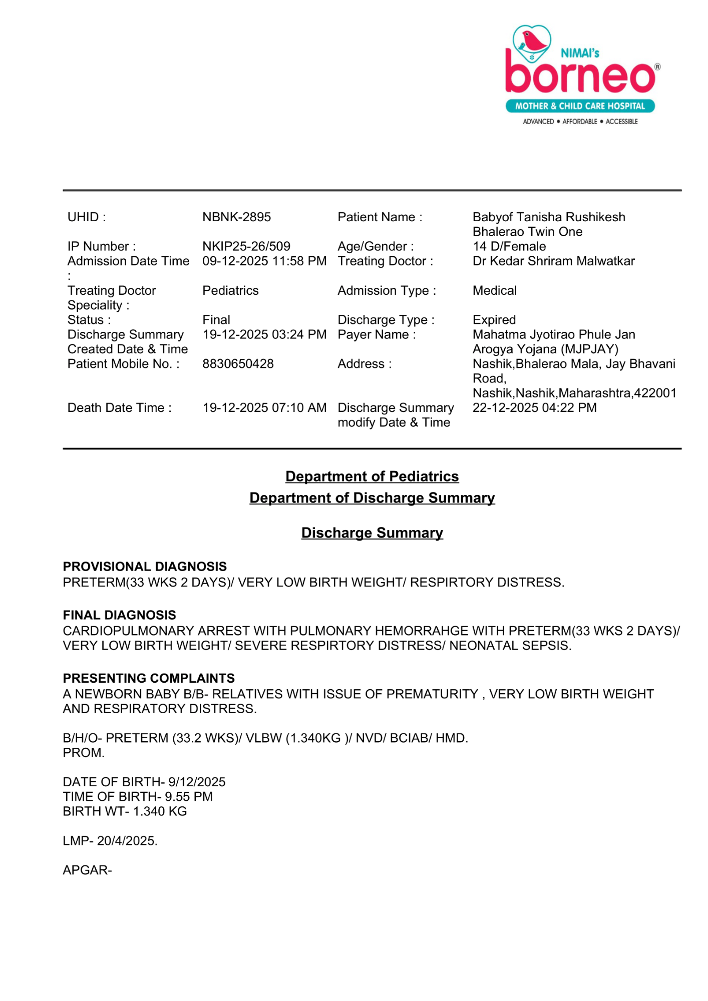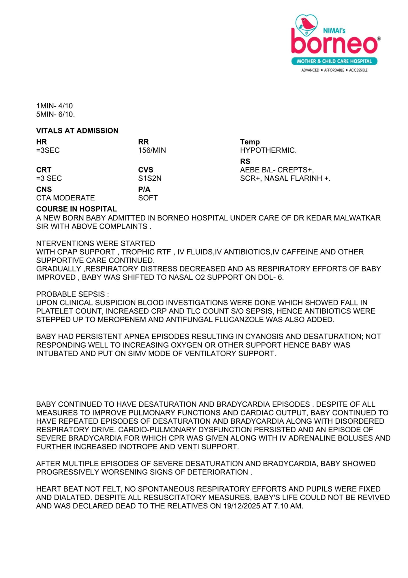 She is currently admitted to the NICU at Nimai’s Borneo Mother & Child Care Hospital, Nashik, where she requires continuous life-saving medical management, respiratory support, and round-the-clock monitoring. Doctors have advised an extended NICU stay of approximately 25 days to stabilize her condition and give her a fighting chance at life.