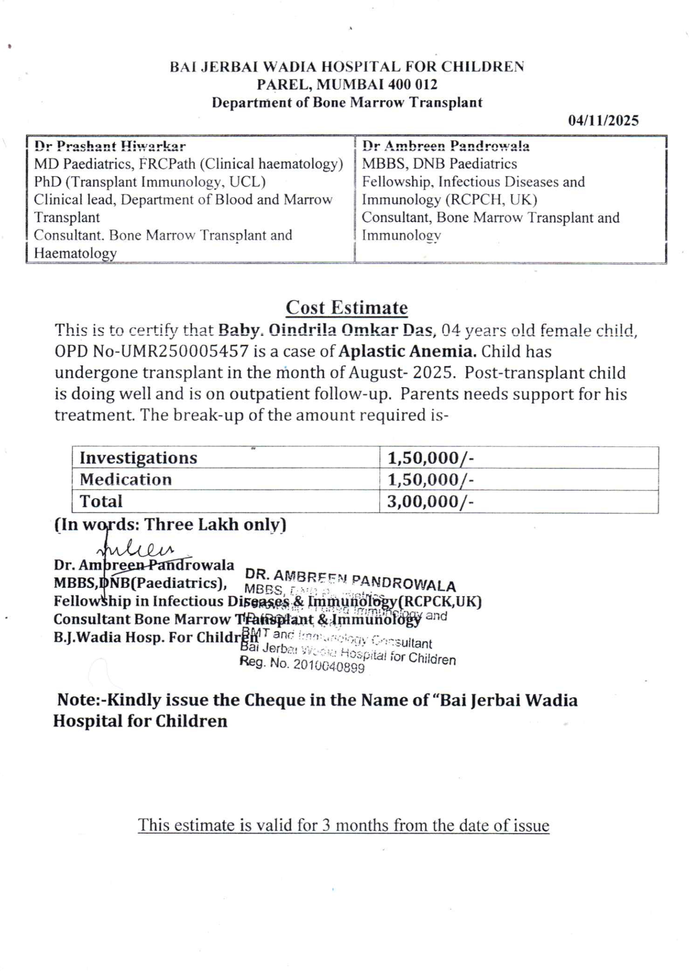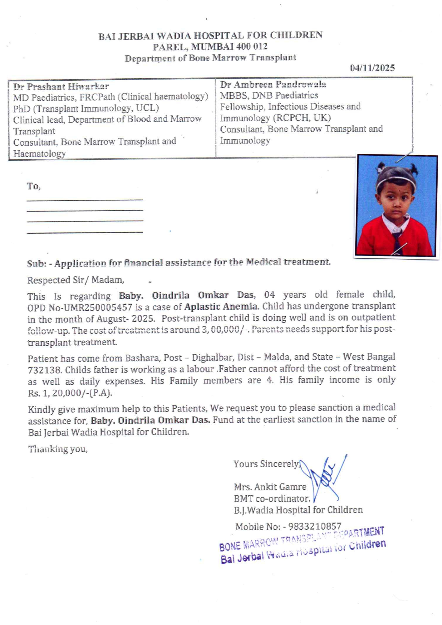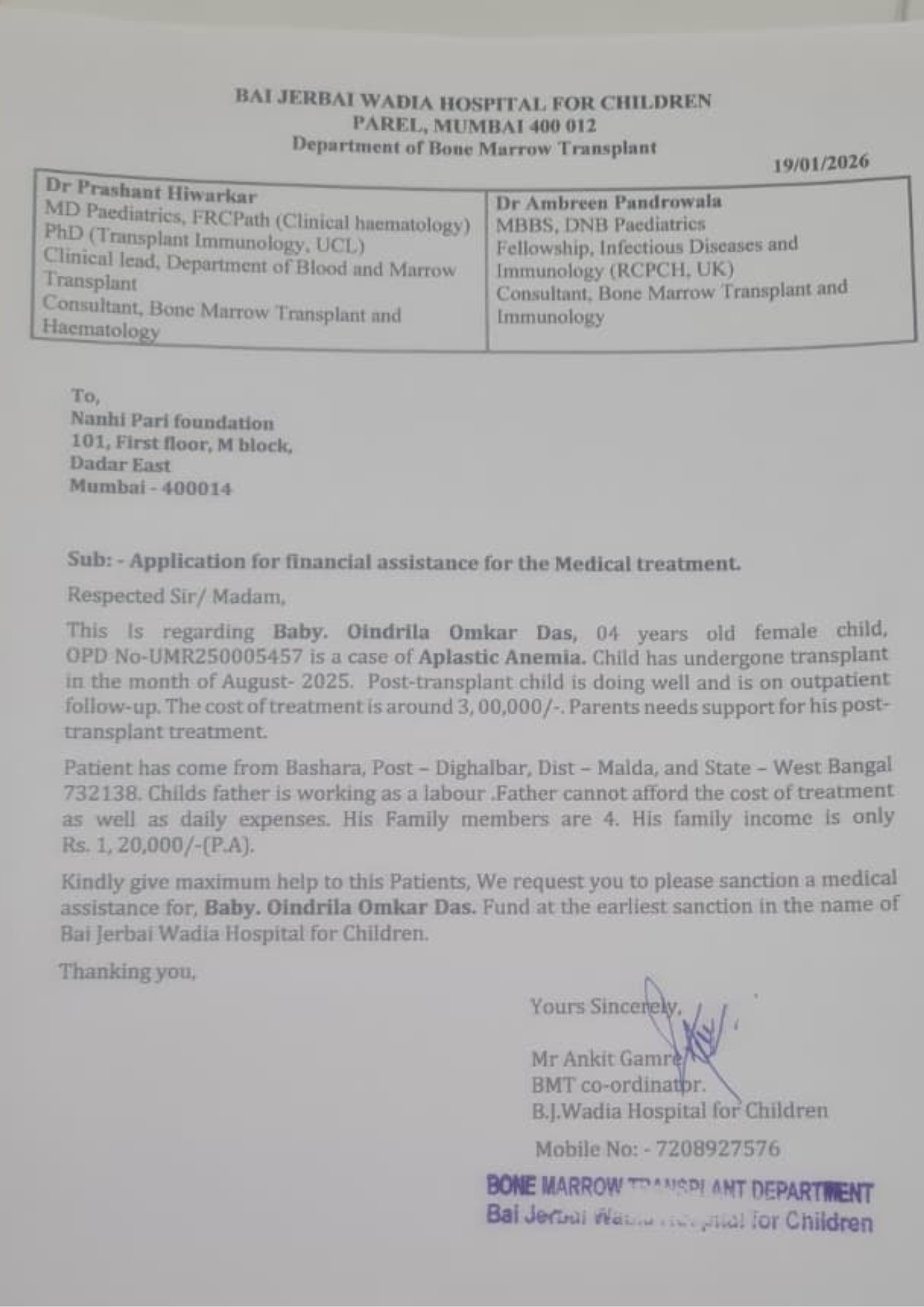 In August 2025, Baby Oindrila underwent a life-saving Bone Marrow Transplant at the Bai Jerbai Wadia Hospital for Children, Mumbai. We are relieved to share that she is currently doing well in the post-transplant phase. However, her recovery journey is ongoing and requires careful, long-term medical attention.