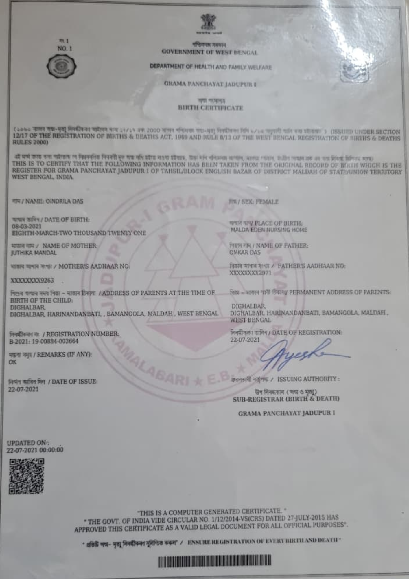 Patient: Baby Oindrila Omkar Das (OPD No: UMR250005457)