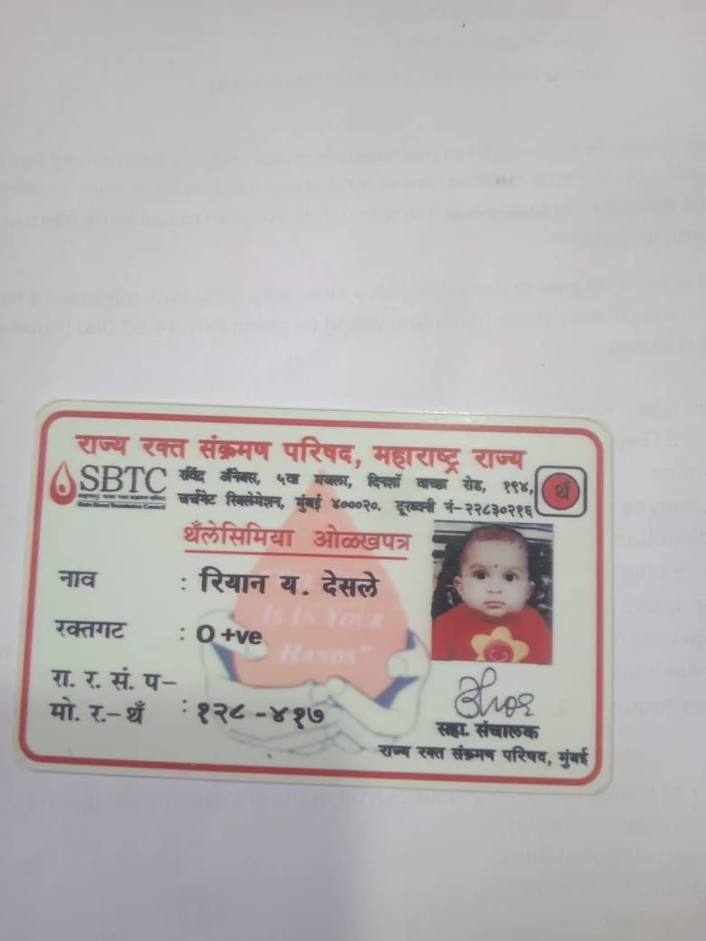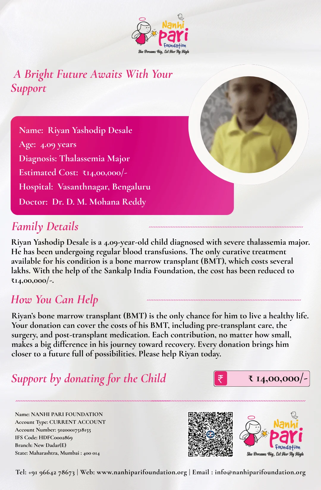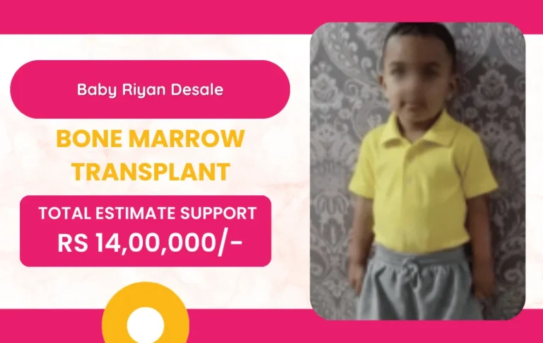 Baby Riyan Desale is bravely fighting for his life after being diagnosed with a severe medical condition that can only be cured through a Bone Marrow Transplant (BMT). This life-saving procedure is urgently required to give him a chance at survival.
