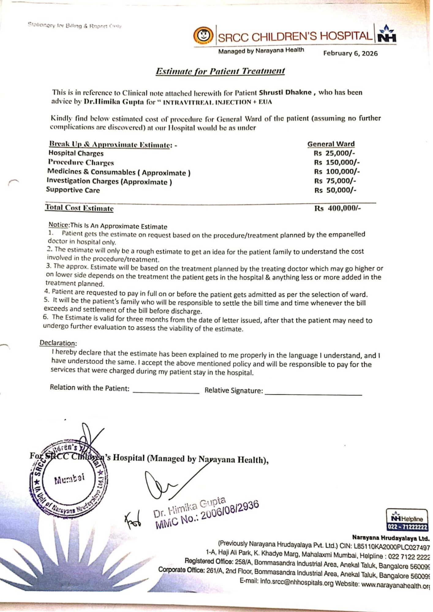 Medical Recommendation & Cost Breakup, As per the hospital’s official estimate, the total cost of treatment is **₹4,00,000**, which includes: Hospitalisation charges Surgical procedure for Eye Cancer Pre-operative and post-operative care Medicines and supportive treatment Diagnostic tests and investigations Specialised medical supervision