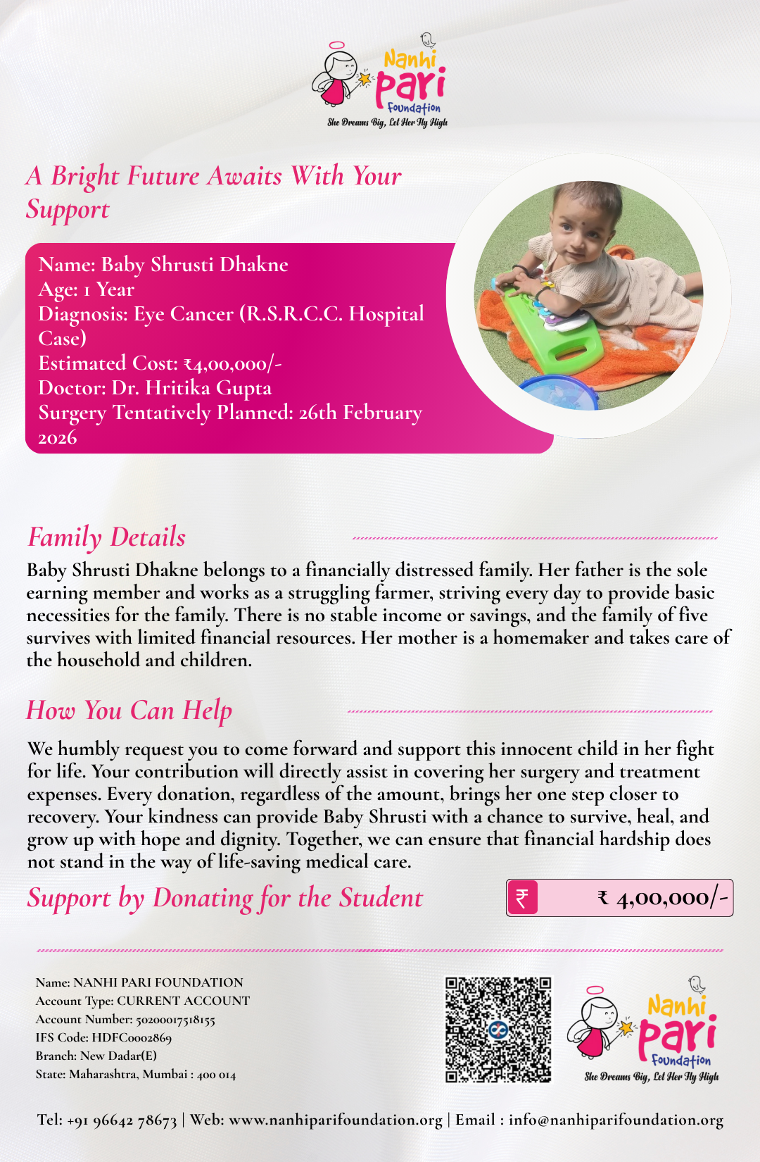 Baby Shrusti Dhakne, a 1-year-old girl, has been diagnosed with **Eye Cancer**. Medical reports from S.R.C.C. Hospital, Mahalaxmi, confirm the severity of her condition and the urgent need for surgical intervention to prevent life-threatening complications.