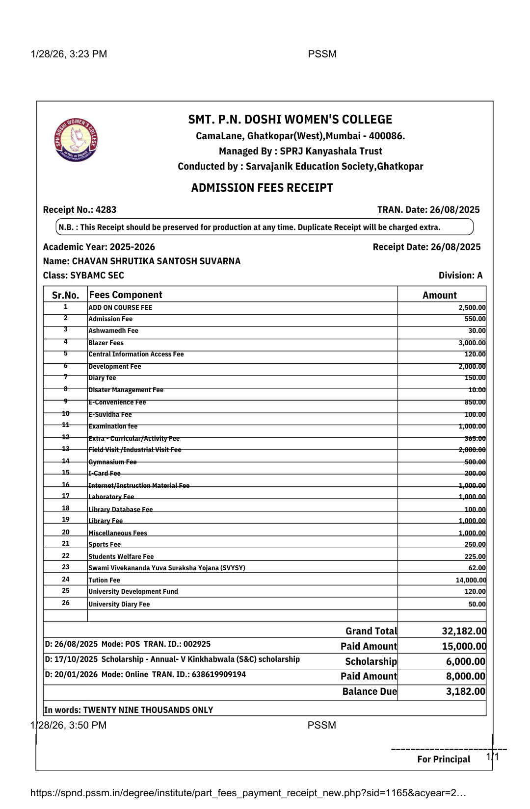 Amount Paid / Scholarship Received ₹29,000
