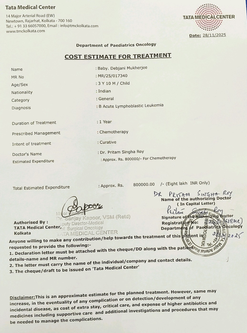 Baby Debjani Mukherjee, a 3-year-10-month-old little girl, is bravely fighting B-Acute Lymphoblastic Leukemia (Blood Cancer). She is currently admitted at Tata Medical Center, Kolkata, undergoing chemotherapy and intensive medical treatment.