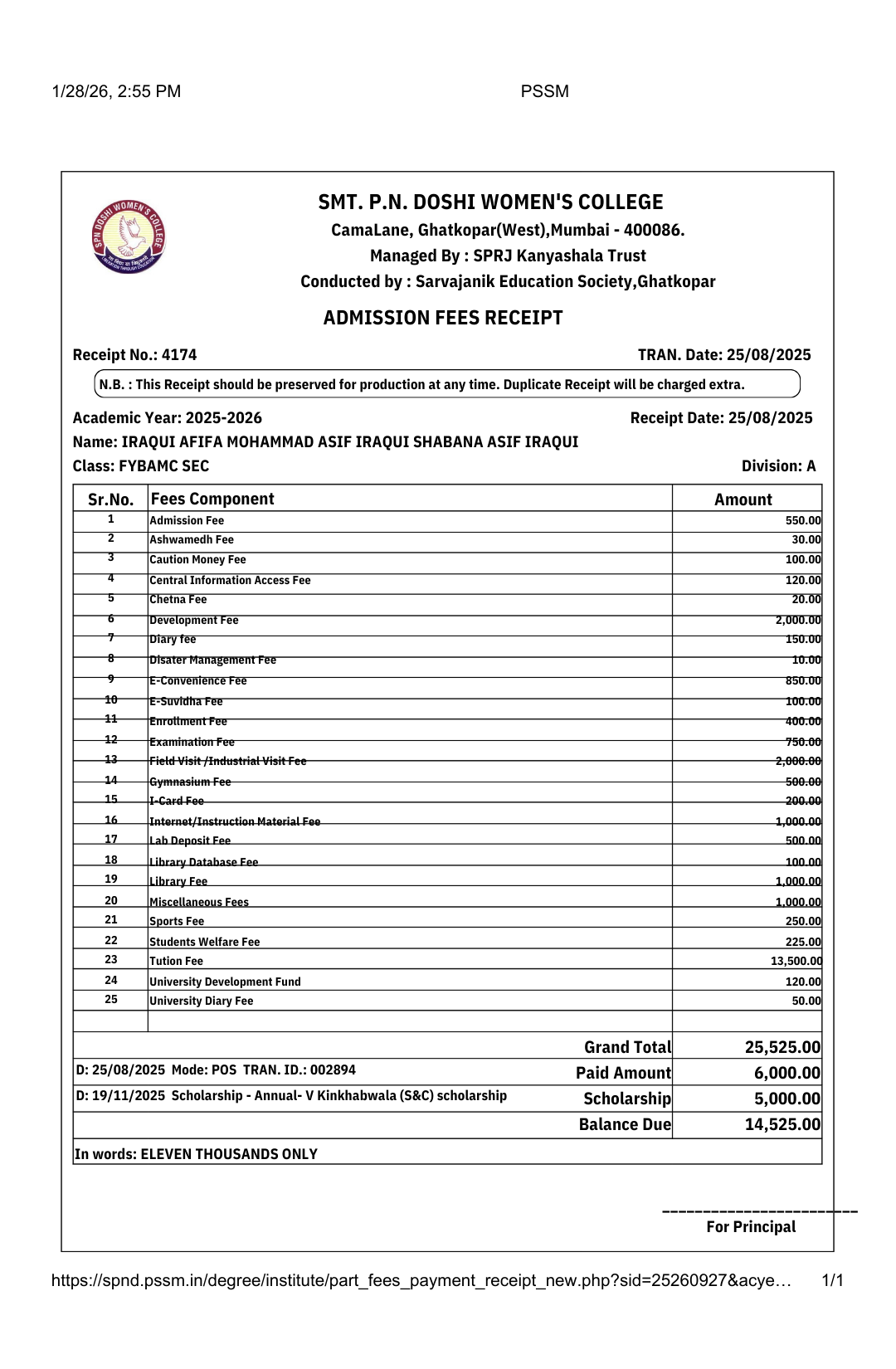 Amount Paid / Scholarship Received: ₹11,000