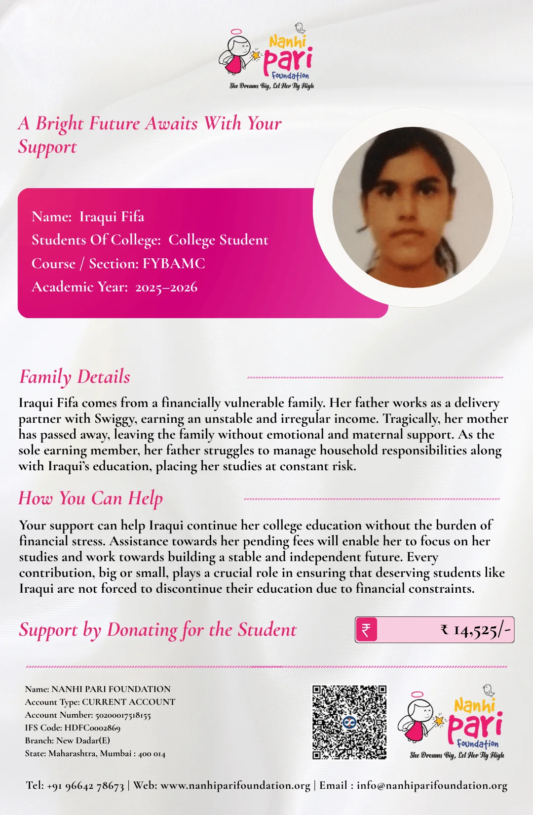 Join Nanhi Pari Foundation in ensuring Iraqui’s education is not interrupted due to unpaid college fees. Your sponsorship can change her future.