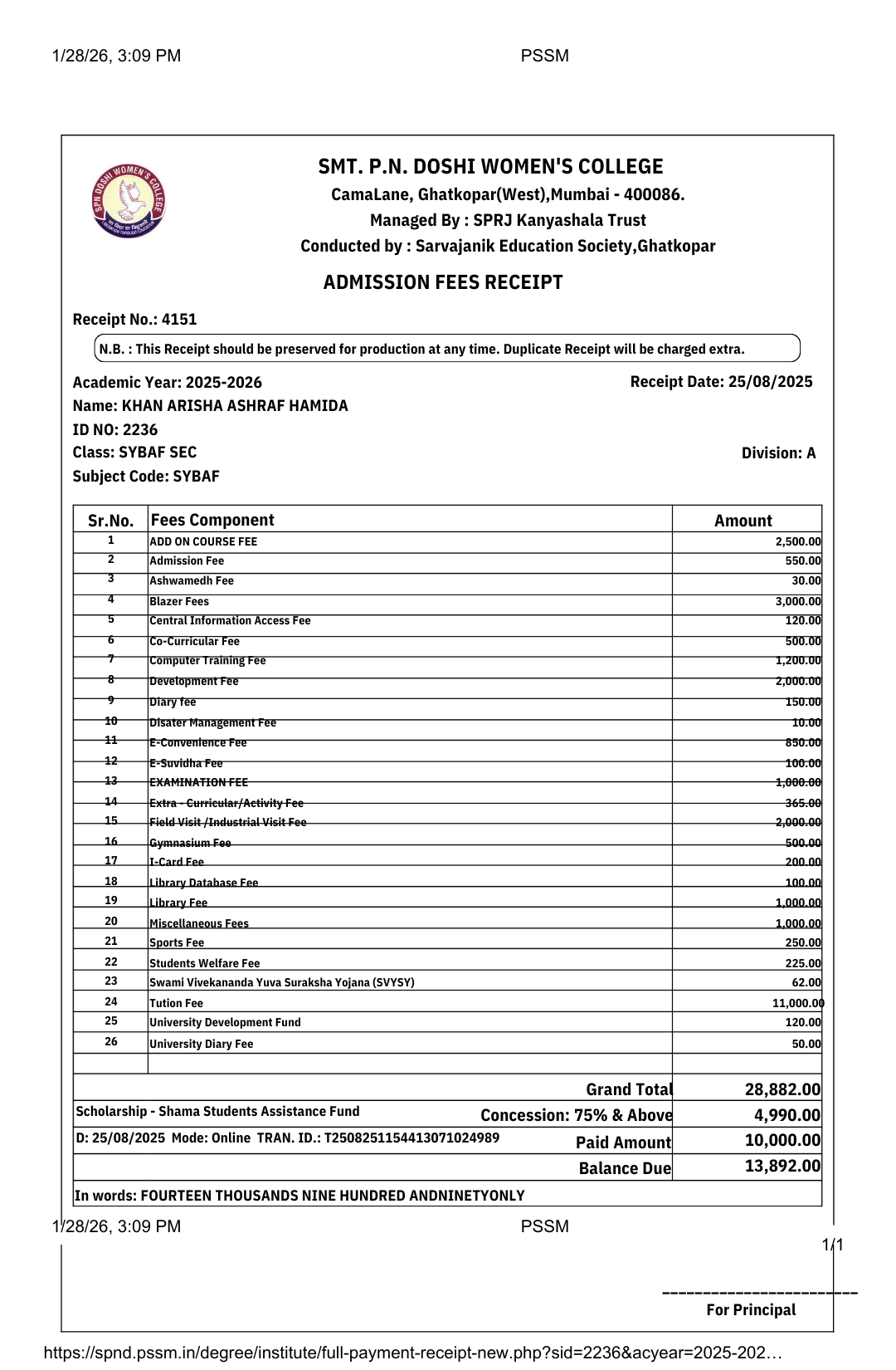 Amount Paid / Scholarship Received: ₹14,990