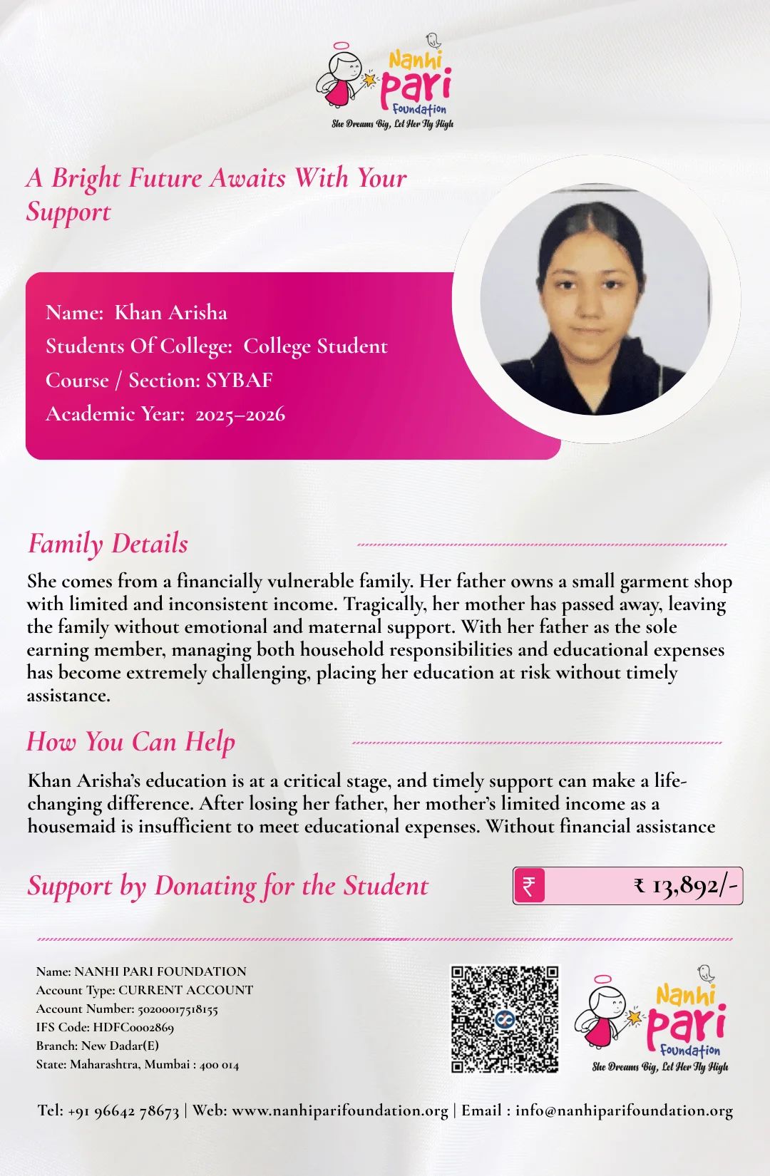 Educational assistance is required to help Arisha continue her studies without financial pressure.
