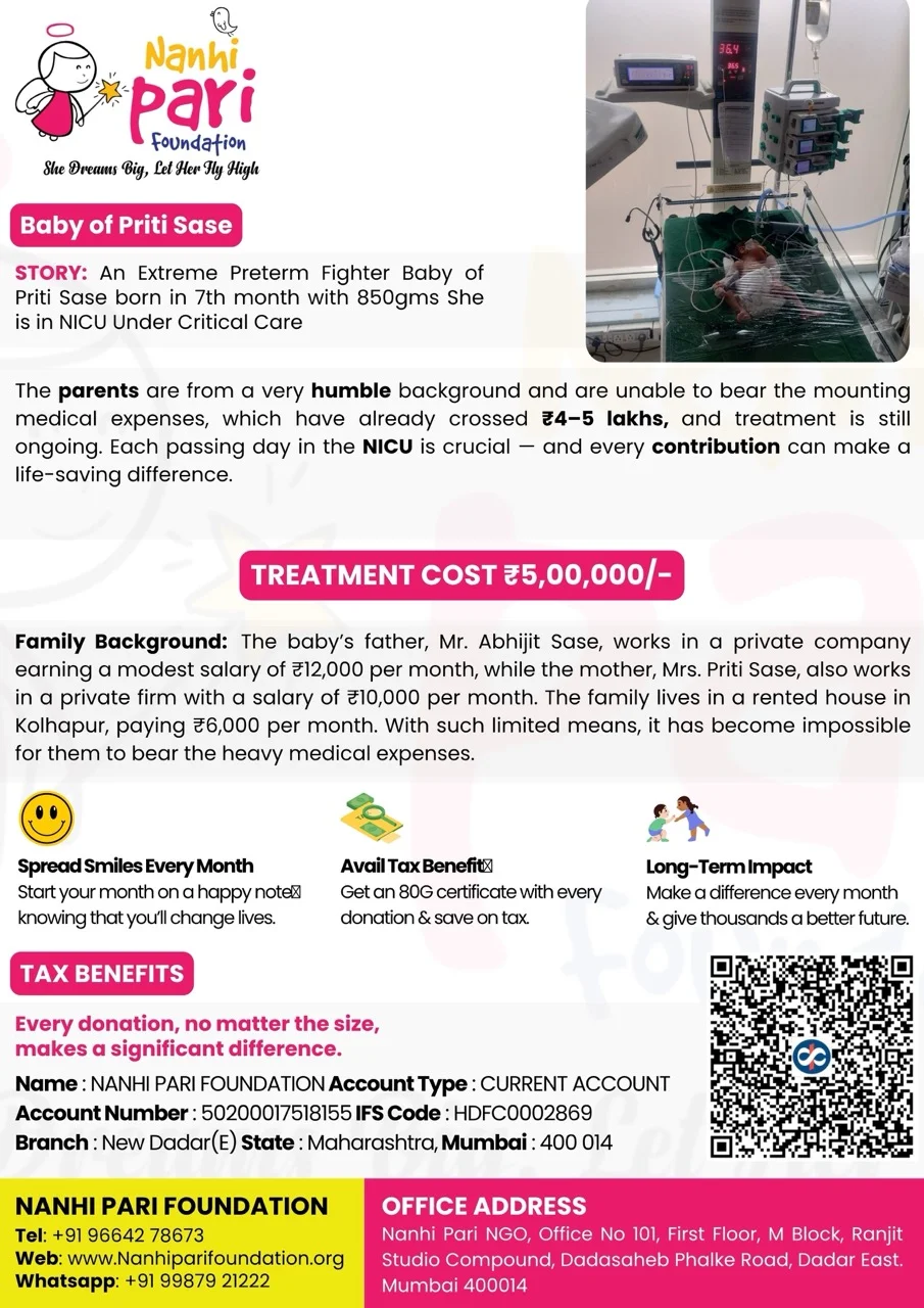 Doctors have advised continued NICU treatment, with expenses estimated between ₹4,00,000 to ₹5,00,000. Each passing day in the NICU is critical for her survival — and every contribution can make a life-saving difference.