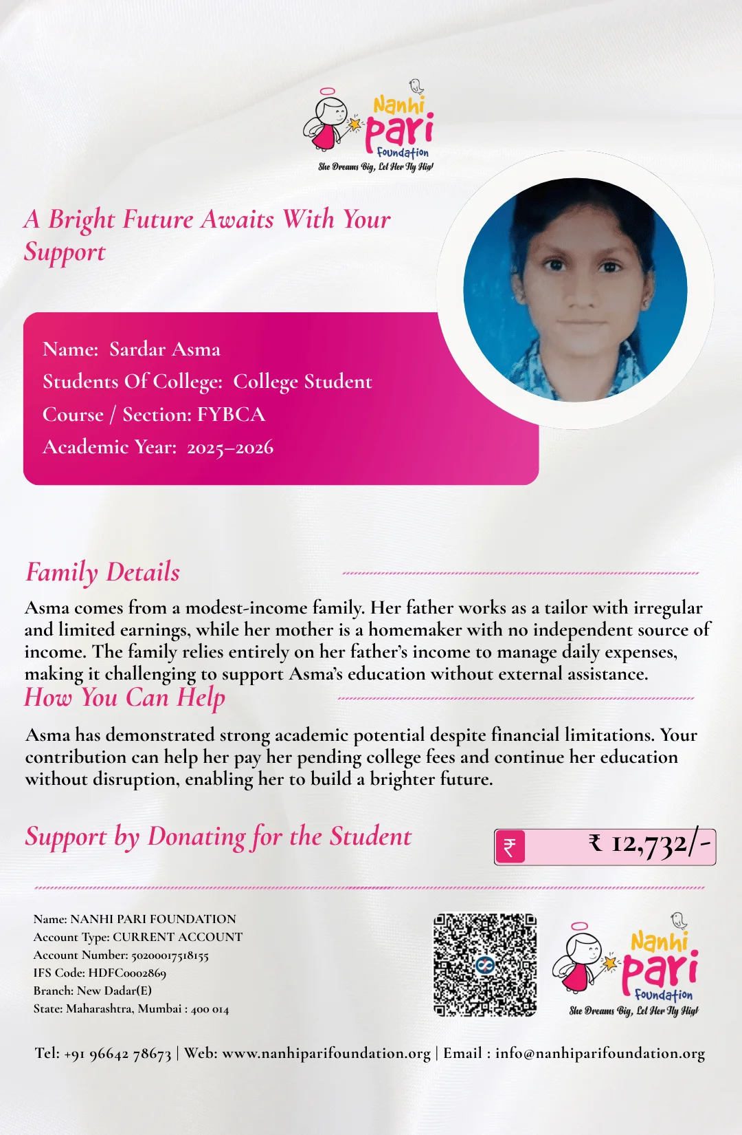 Sardar Asma’s father works as a tailor, and her mother is a homemaker. The family of five earns an annual income of ₹1,00,000, or ₹55 per person per day.
