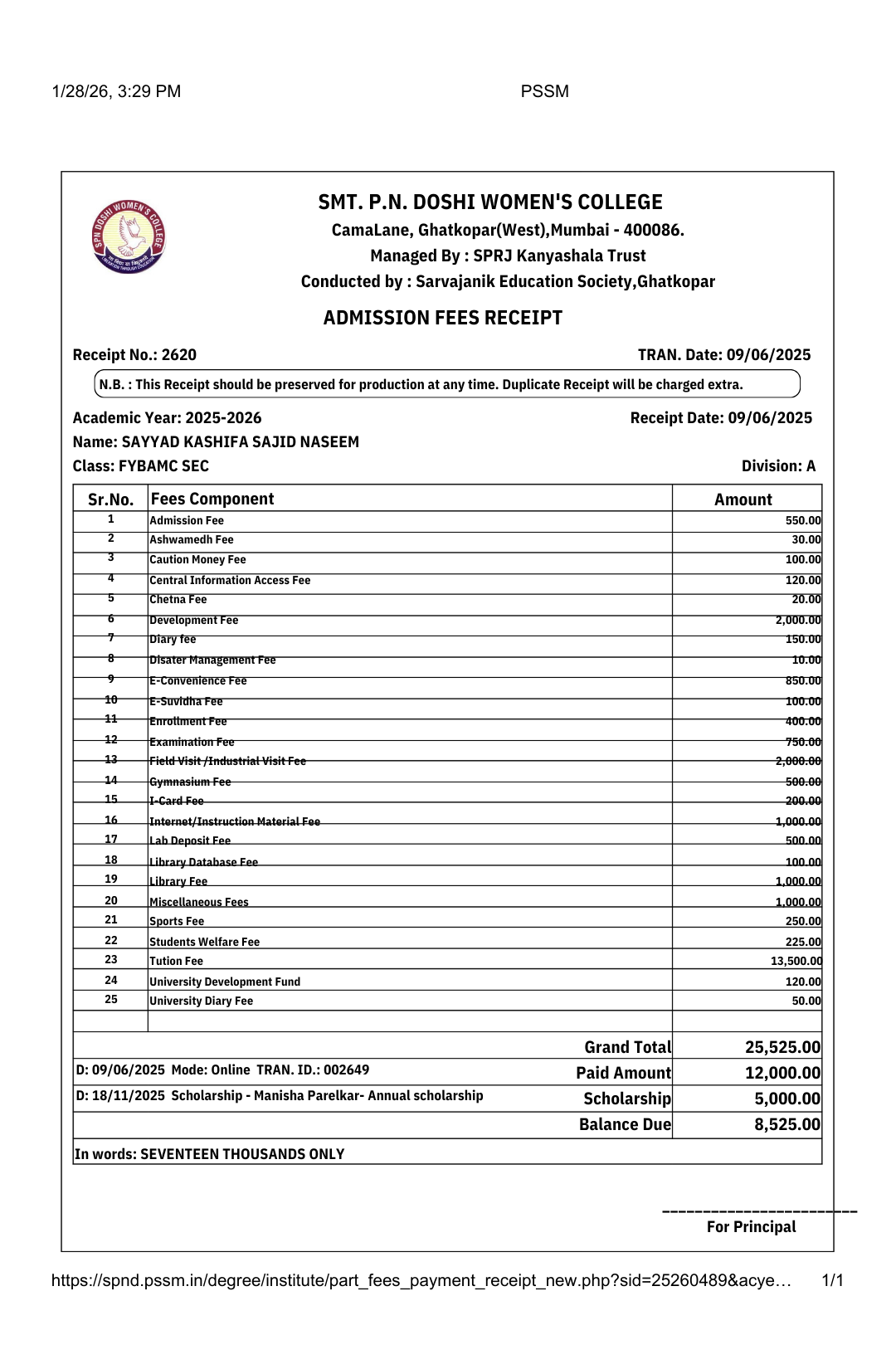 Total Course Fees: ₹25,525 Amount Paid / Scholarship Received: ₹17,000 Pending Amount Required: ₹8,525 Support Needed: Financial support is needed to clear the remaining fees so Kashifa can continue her education without interruption.