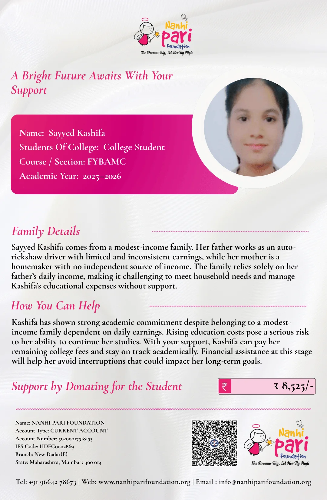 Help Kashifa, a FYBAMC student, continue her studies despite her father’s limited income.