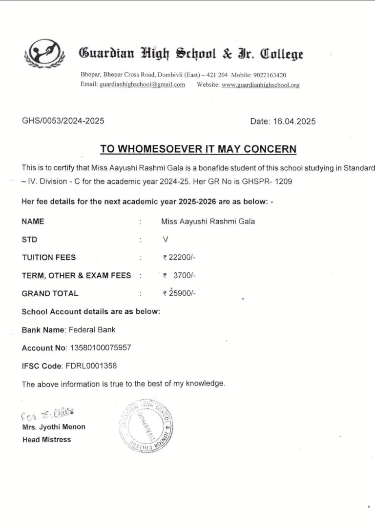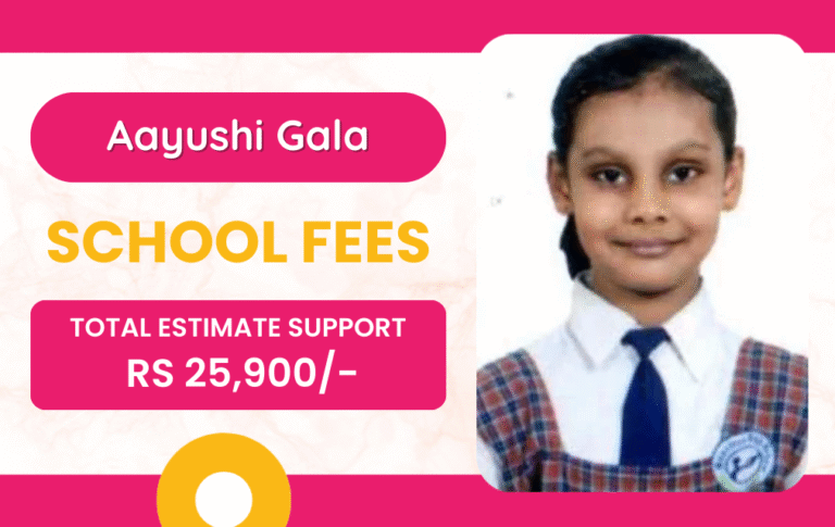 Because of these financial challenges, Mrs. Gala is unable to arrange her daughter’s school fees for the academic year 2025–2026, amounting to ₹25,900. Despite the hardships, Aayushi remains a bright and hardworking student who wishes to continue her studies like other children.