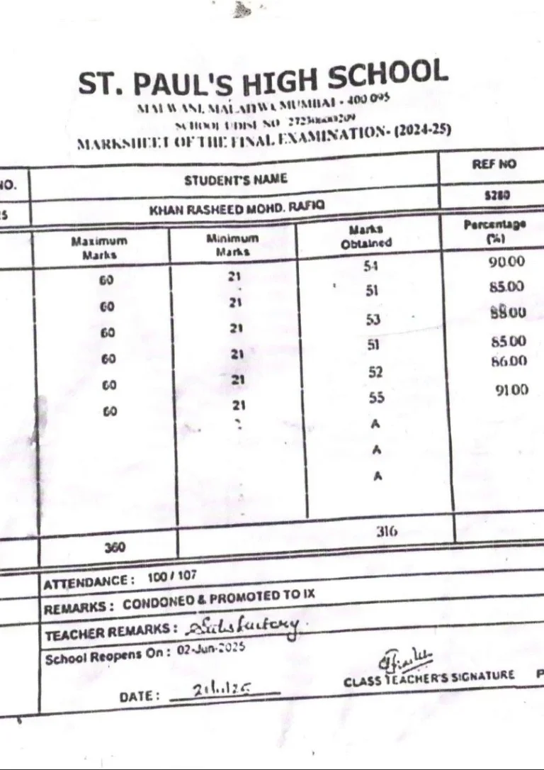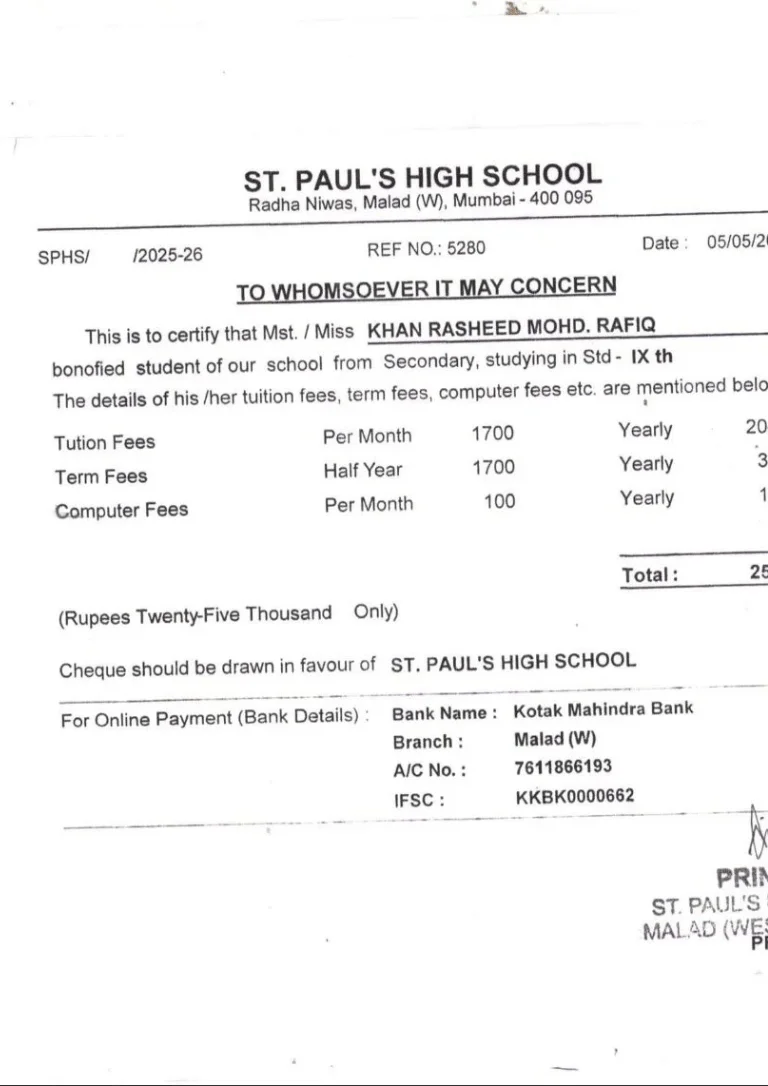 Because of these financial constraints, Mrs. Khan is unable to arrange her son’s school fees for the academic year 2025–2026, amounting to ₹25,000. Despite the hardships, Rasheed is a bright and sincere student who wants to continue his studies like his peers and avoid dropping out at this critical stage.