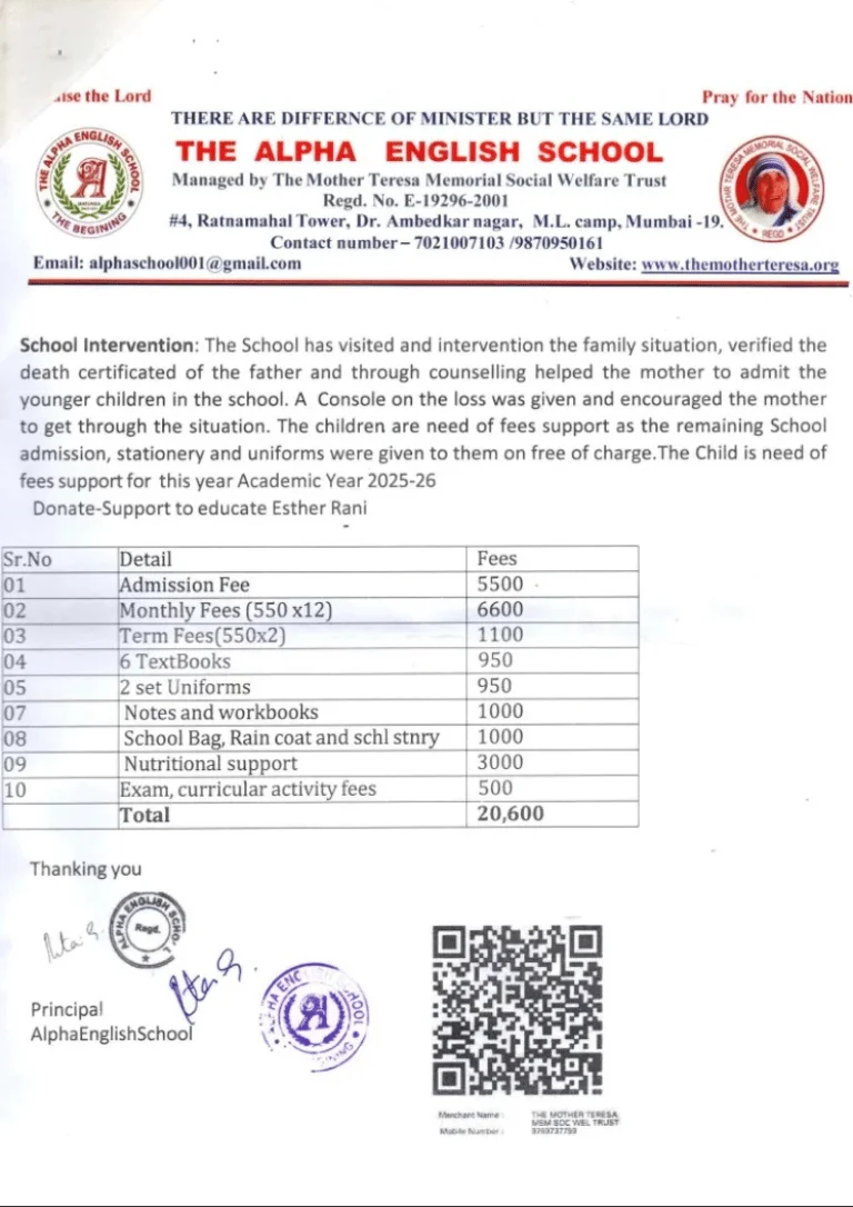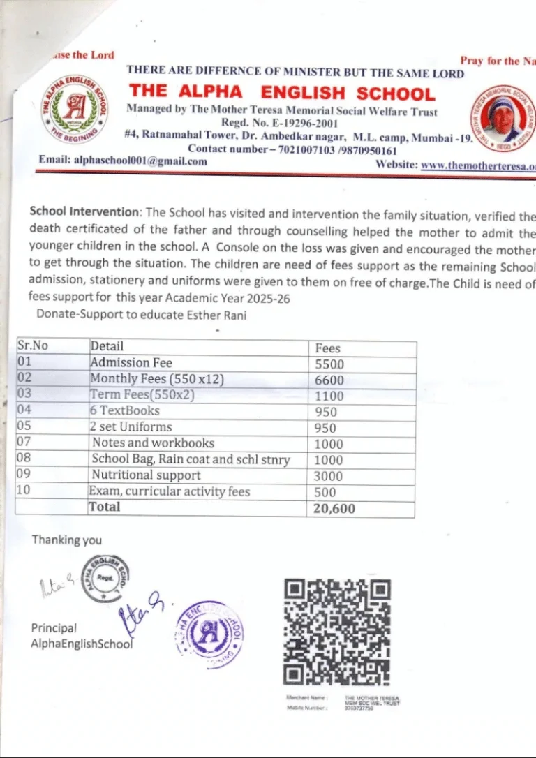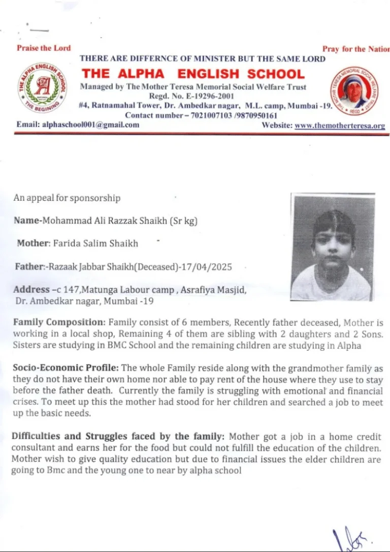 Ali is being raised by his mother, Mrs. Farida Salim Shaikh, a single mother and the sole earning member of a 6-member family. She works in a local shop to manage the household’s daily needs. With her limited income and no additional financial support, it has become extremely difficult for her to afford Ali’s school fees for the academic year 2025–2026, amounting to ₹20,600.