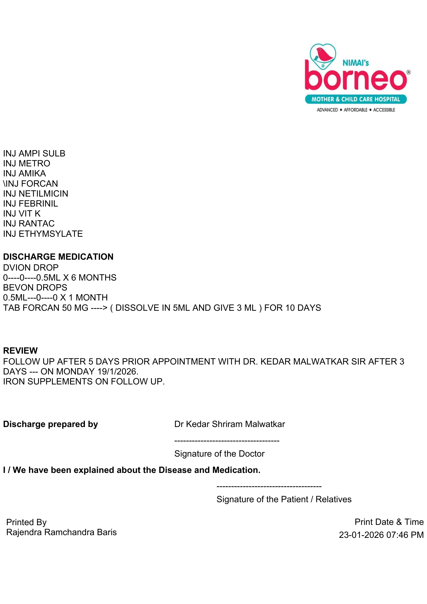 The surgical stitches have been removed, and the baby has shown consistent overall improvement with stable vitals. Based on her progress, the doctors have discharged the baby in stable condition, with prescribed medicines and clear follow-up advice to ensure continued healthy growth at home.