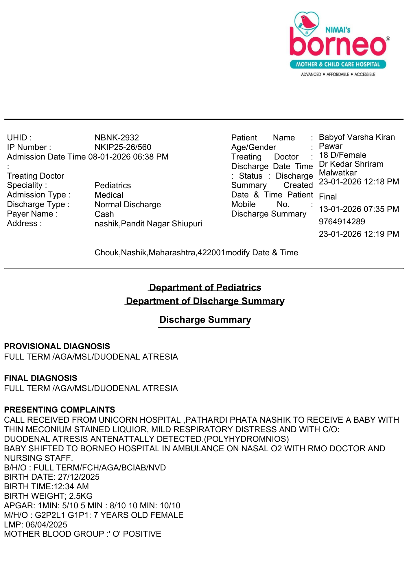 Baby of Varsha Kiran Pawar was admitted with a critical gastrointestinal condition that required urgent surgical intervention. After thorough evaluation, the medical team proceeded with an exploratory laparotomy with duodeno-jejunostomy to correct the underlying problem and ensure normal feeding and digestion.