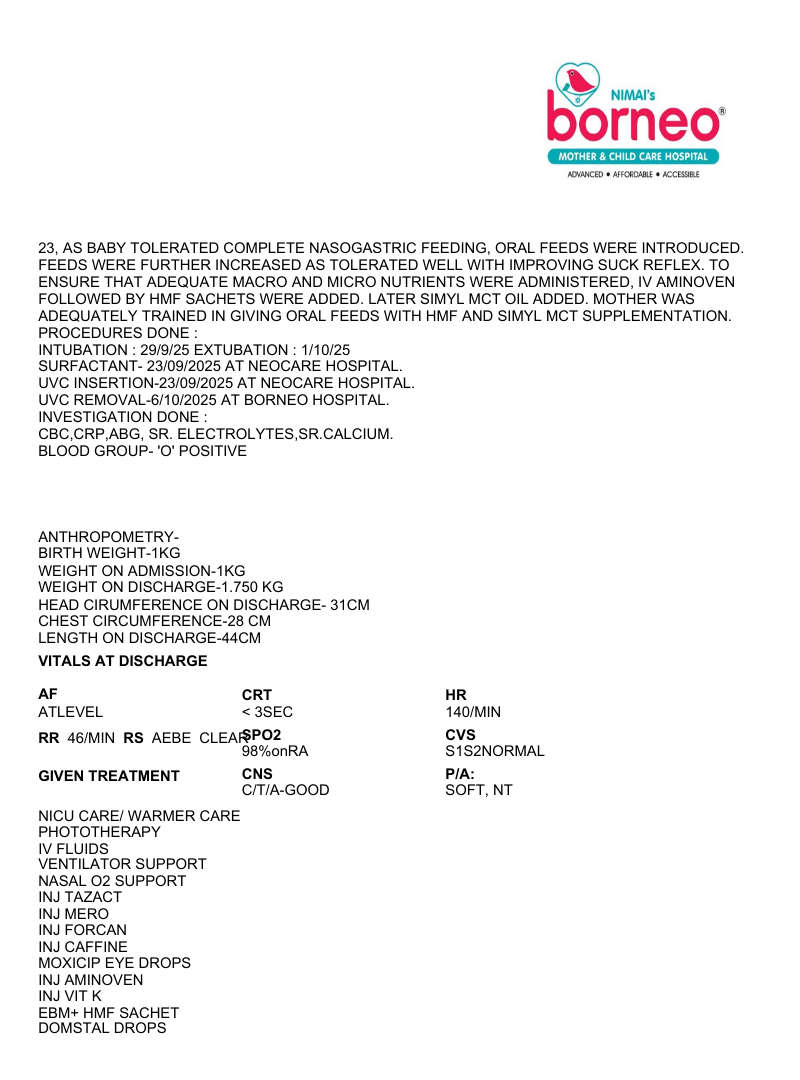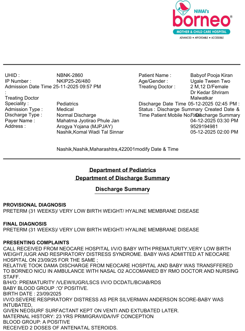 Discharge Milestones Twin 1 was discharged: 18th November 2025 Twin 2 was discharged: 5th December 2025 Their parents, emotionally and financially exhausted, faced overwhelming fear as the twins fought severe complications. But your support made their survival possible. The NICU treatment, ventilators, medications, and around-the-clock care were far beyond what the family could afford.